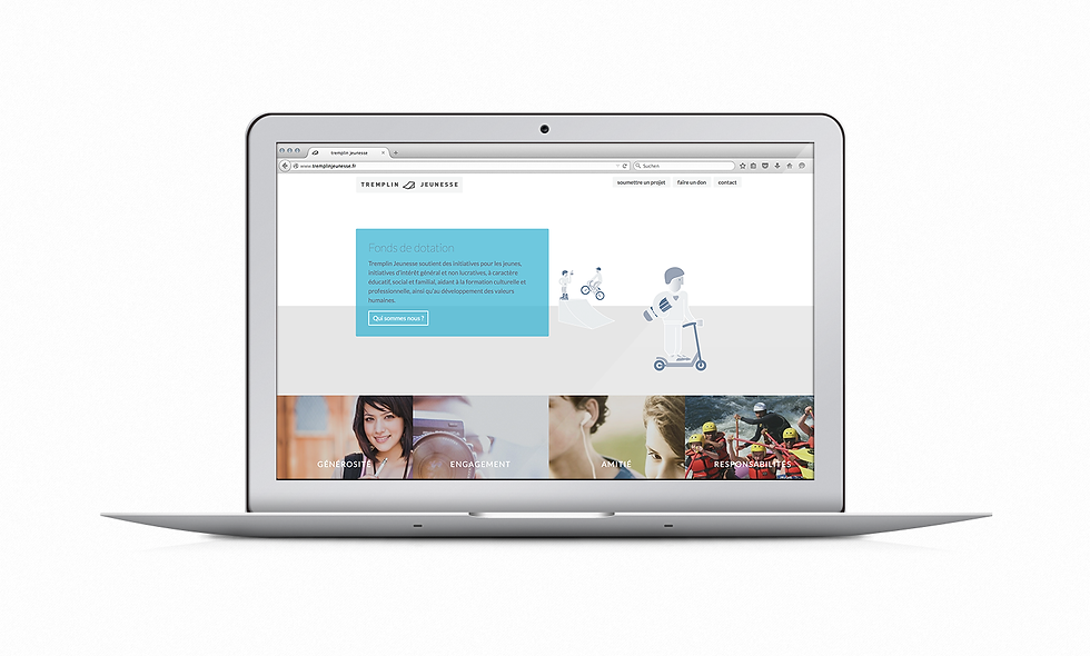 Tremplin Jeunesse est un fond de dotations Parisien soutenant des initiatives pour les jeunes, initiatives d’intérêt général et non lucratives, à caractère éducatif, social et familial, aidant à la formation culturelle et professionnelle, ainsi qu’au développement des valeurs humaines. Tremplin Jeunesse est une association de cinq femmes actives; elles m'ont sollicité pour donner une forme visuelle à leur projet. J'ai élaboré une charte graphique incluant un logo, cinq icônes traduisant les valeurs portées par Tremplin Jeunesse ainsi que des illustrations vectorielles flatdesign pour habiller les supports de communications. J'ai réalisé l'ergonomie et le web design du site internet Tremplin Jeunesse, ainsi que la plaquette de présentation destinée aux différentes institutions. Mon approche ludique s'appui sur le tremplin, symbole positif d'ascencion et de réussite. Mes personnages aux formes simples visent l'universalité, chaque jeune peut s'identifier ou s'y retrouver.